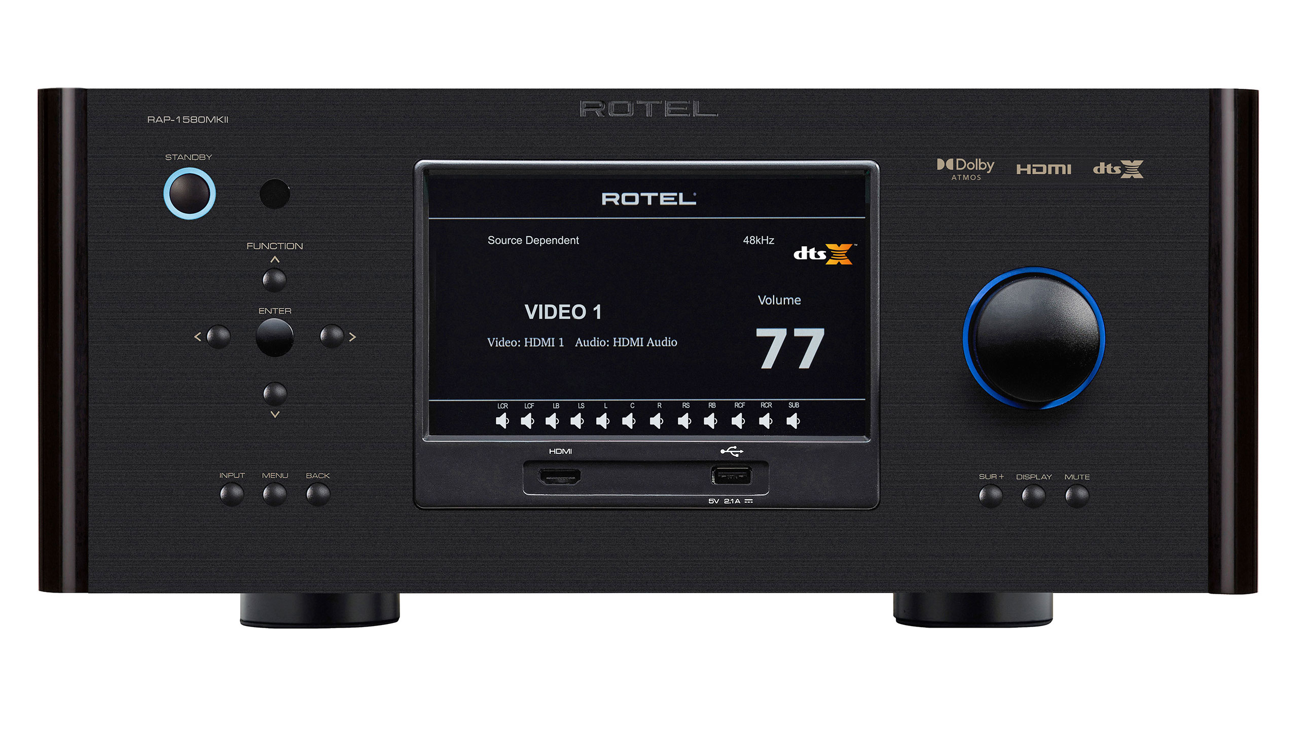 The setup functions are located on the HDMI display and also on the front display, making it easy to configure the system even if the device is installed in a different location in a rack. This Surround Sound Processor works well with Rotels portfolio of class AB power amplifiers; thanks to a heavy toroidal transformer, these amplifiers deliver enough power: