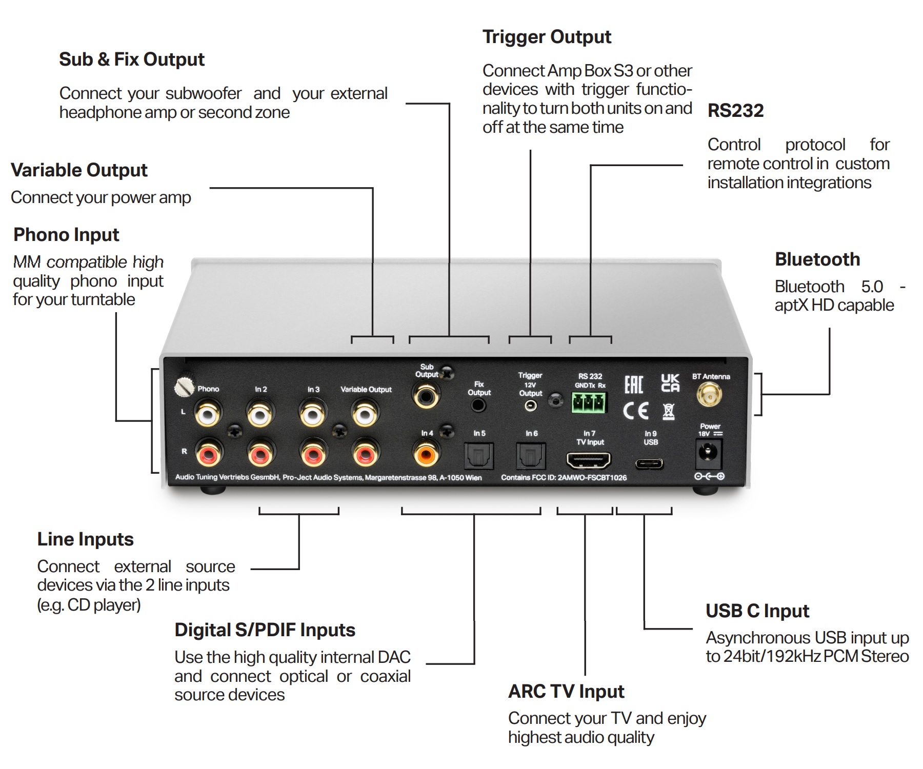 The specified S/N ratio is 110 dB (120 dB, A-weighted) and the channel separation is 72 dB at 10 kHz. Pro-Ject Audio claims a frequency response of 20 Hz to 20 kHz at -0.4 dB. The enclosure dimensions are 206 x 55 x 153 millimeters (W x H x D). The depth, including the connections, is 176 millimeters.