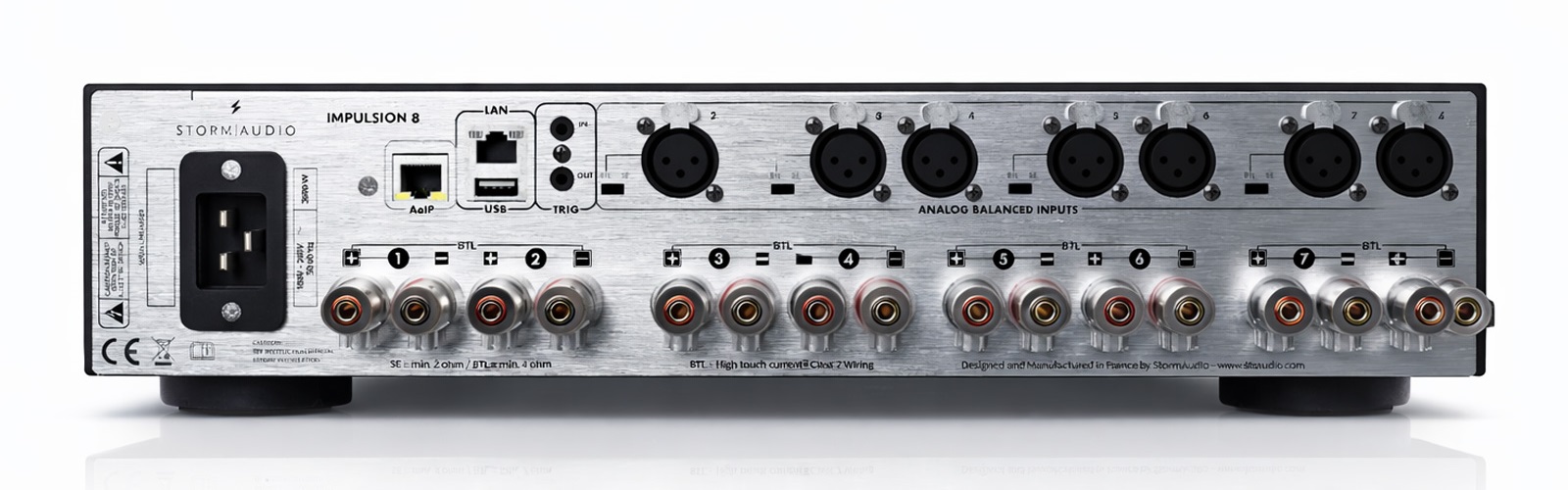 An important aspect of the Impulsion 8's design is its ability to integrate directly into the broader StormAudio ecosystem. In combination with a StormAudio AV processor, the amplifier can be automatically detected and configured, significantly reducing installation time.