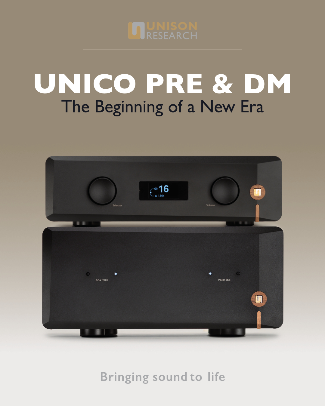 Unison Research has unveiled a new set of amplifiers. The Unico V2 series consists of the Unico Pre V2 preamplifier and the Unico DM V2 power amplifier. Both amplifiers feature a hybrid circuit, i.e., with tubes and solid-state amplifiers, and a dual-mono design.