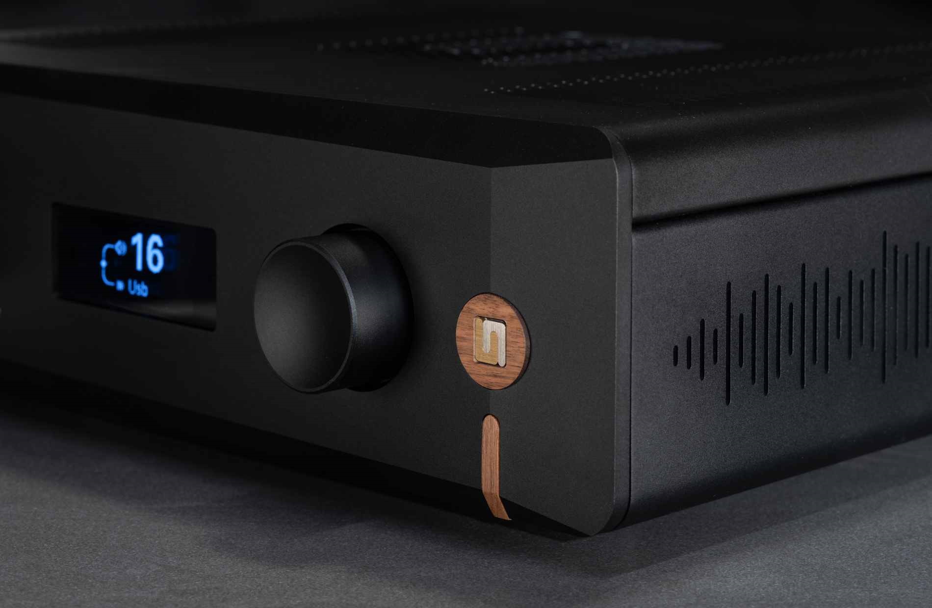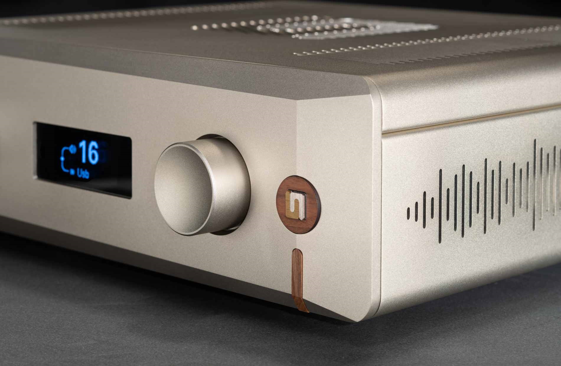 The front panel, like the Unico PRE V2, is made of 15mm-thick aluminum, and the manufacturer offers a choice of Midnight Black and Velvet Gold finishes. The two-millimetre-thick aluminum top plate encloses the entire amplifier. The wooden inlays reference the historic Unico logo.