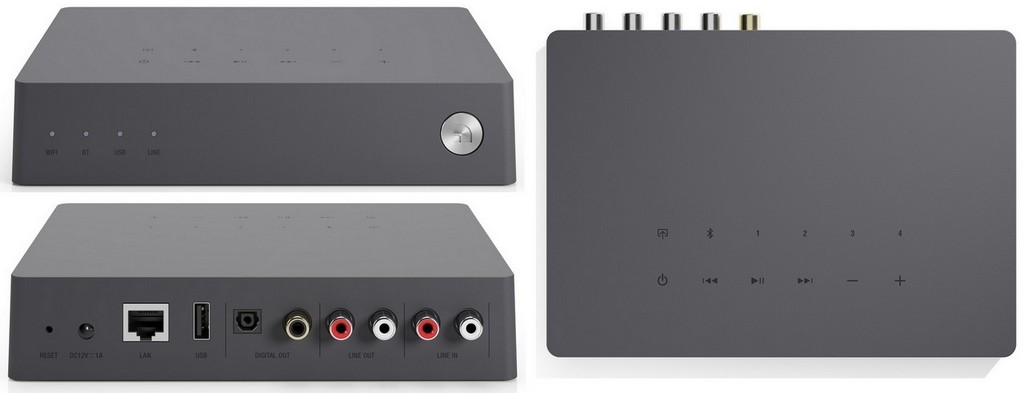 The Ethernet connector (or internal Wi-Fi antenna 802.11 b/g/n 2, 4 and 5 GHz) receives the network audio stream, decodes it to analog and then sends the result to an amplifier, receiver or pair of active speakers via a set of RCA connectors. Alternatively, Link2 can send this digital stream directly to an external D/A converter via TOSLINK and coaxial outputs.