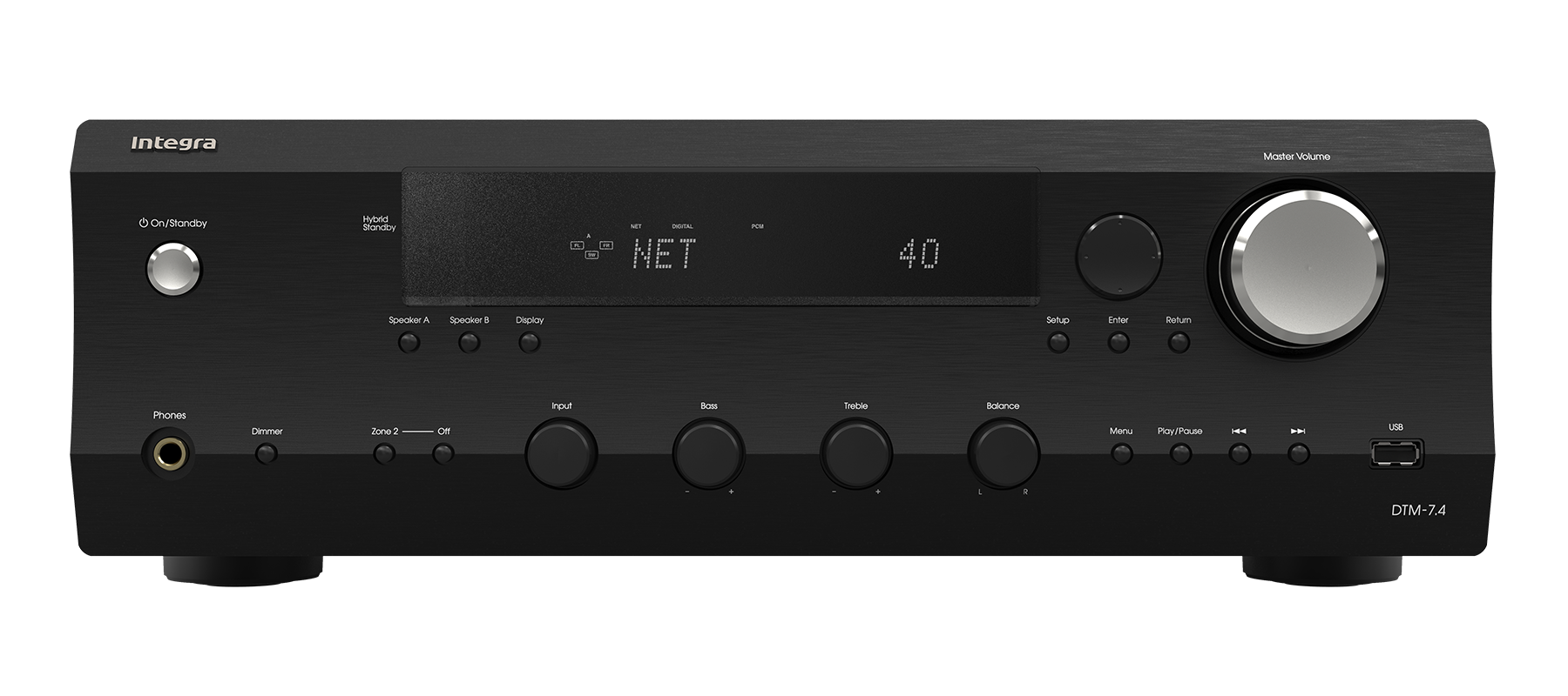 Just like the Onkyo TX-8470, the Integra DTM-7.4 is a two-channel amplifier with radio functions, streaming functions and an abundance of analog and digital connections, including HDMI connections and a turntable input. The output stages operate in class G and can deliver 110 Watts per channel at eight Ohms. The DTM-7.4 seems to be made for those who don't need surround sound and the additional amount of speakers and installation complexity.