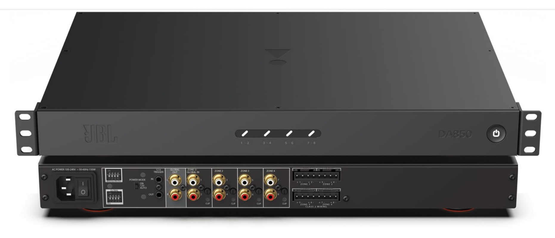 According to JBL, both the DA850 and DA1650 offer 50 watts of power for each of their Class D channels at eight ohms and 110 watts at four ohms. By bridging their outputs, the rated power increases to 185 watts at eight ohm loads. For added flexibility, each audio zone can contain an independent source, or a single source can be shared across all zones using the common audio input. Additionally, zones that share an audio source can be expanded across multiple amplifiers using the global audio output.