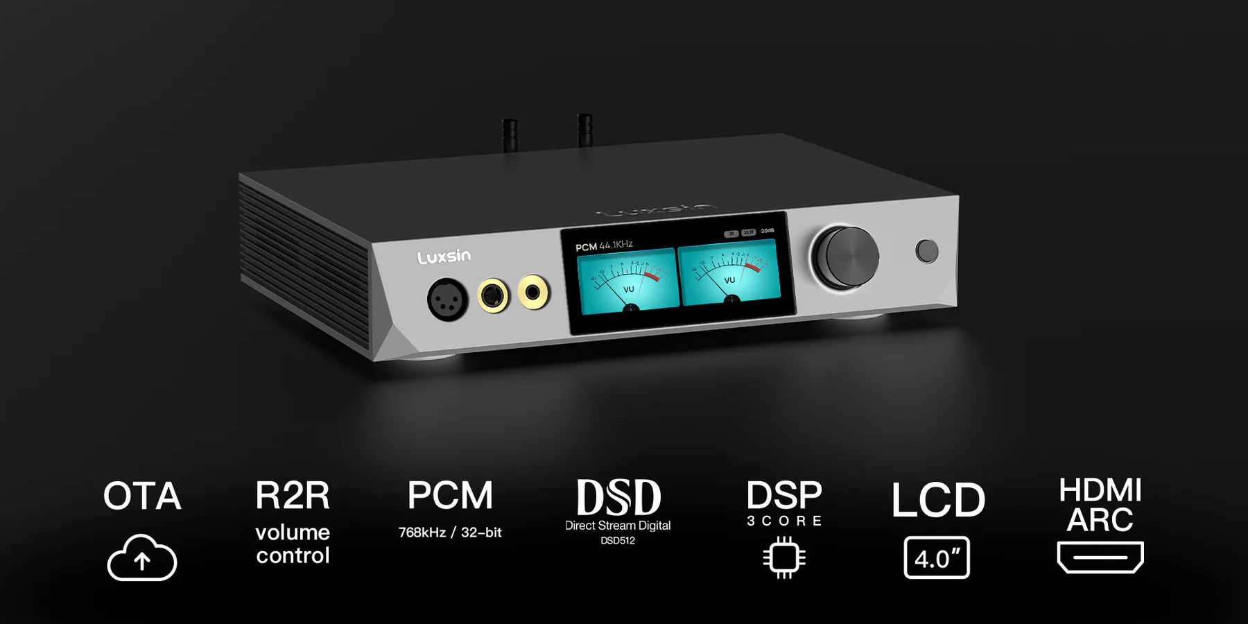 Currently, visual materials are limited, but initial images reveal a color information display featuring VU meters. It is presumed that the four-inch screen can present additional information. The Luxsin X9 includes an HDMI port with Audio Return Channel (ARC) support, although it lacks built-in streaming capabilities.