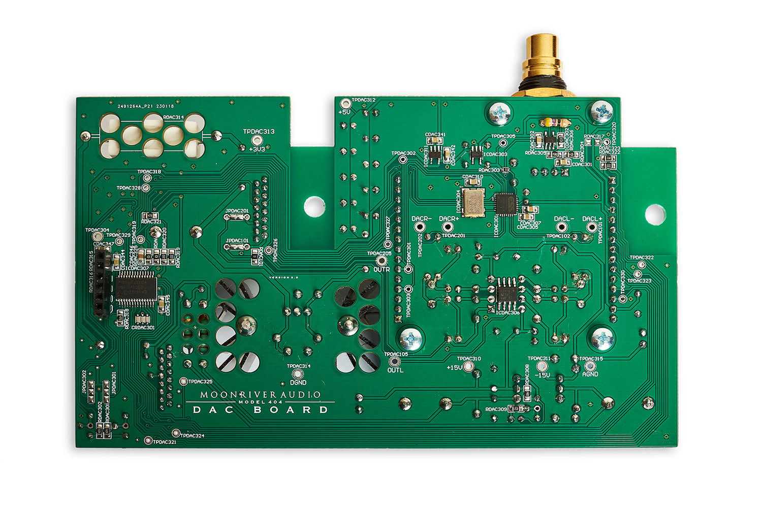 The DAC module is made for installation in a Model 404 or Model 404 Reference from Moonriver Audio and is based on the ESS Saber dac chip from the 9000 series. The SPDIF supports PCM streams up to 24-bit/192 kHz due to the limitation of the (coaxial) SPDIF specifications. The DAC module has three separate power supplies with low noise circuits, two for the ESS DAC board and a power supply for the analog circuit. The capacitor bank is huge and uses 42,000 uF (in the case of 404 Reference) of the power amplifier's power supply.