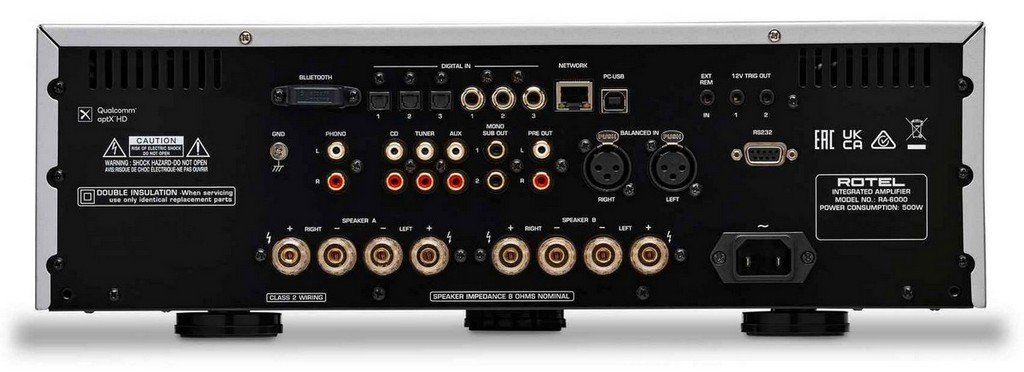 The analog part of the RA-6000 is represented by three analog RCA inputs, one balanced input, an MM phono stage, pre-amplifier and subwoofer outputs. Two sets of speaker terminals allow the use of two sound zones. The power supply and circuitry of the new Diamond Series amplifier are reported to have received a large share of leaked technology and components from both high-end Michi models and more recent MKII products.