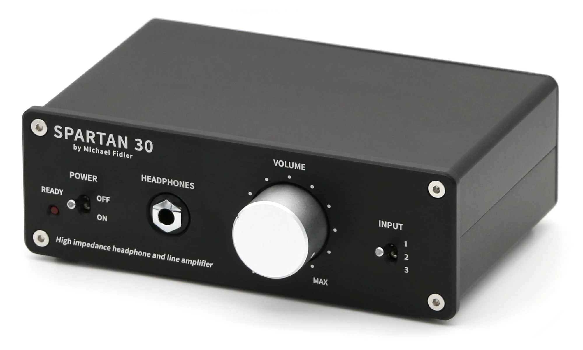 The Spartan 30 is hand built in Kent, Great Britain. It is a small headphone amplifier and preamplifier with three stereo RCA line inputs. These three high impedance cinch line inputs ensure minimal input loss in both modern and vintage equipment, with electromechanical selection carried out via Panasonic relays directly at the input connectors. A new active balanced volume control circuit with an inherently balanced output eliminates the need for additional circuitry on the line outputs for a shorter signal path with less noise. Lowering the potentiometer value from the more conventional 10 kOhm to 5 kOhm also reduced the noise level by a factor of two, according to Michael Fidler's explanation.