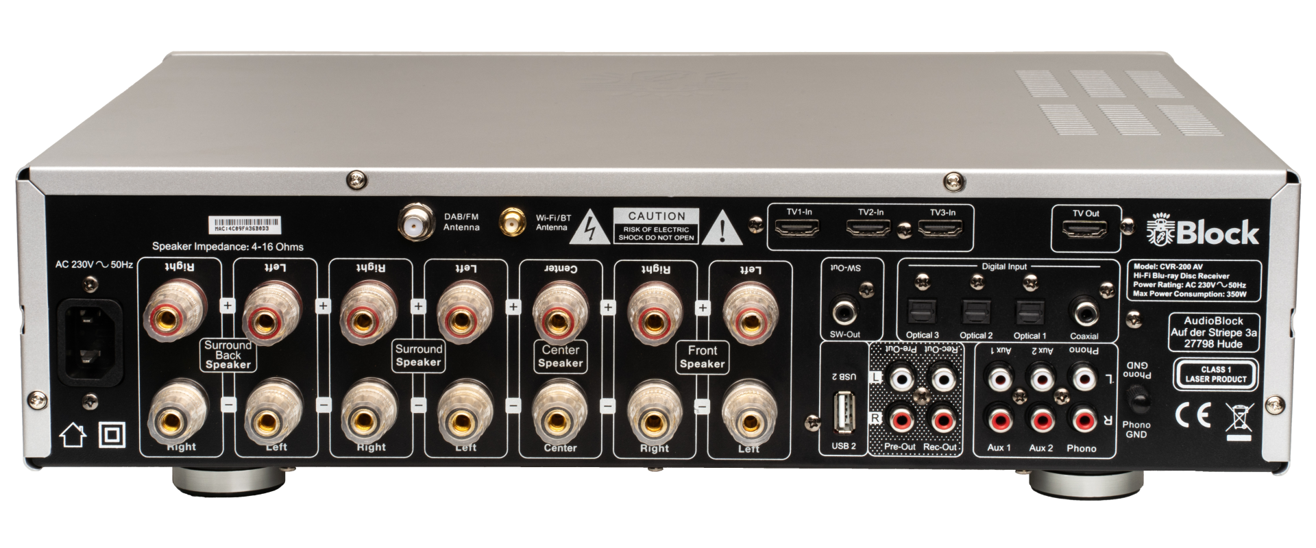 Audioblock, known as Block, has launched the CVR-200 AV, a device specifically engineered for use with passive speakers to facilitate music playback. It also enhances movie experiences with multichannel audio, featuring an integrated BluRay drive and seven amplifier channels. The device boasts a wide range of both analog and digital inputs.