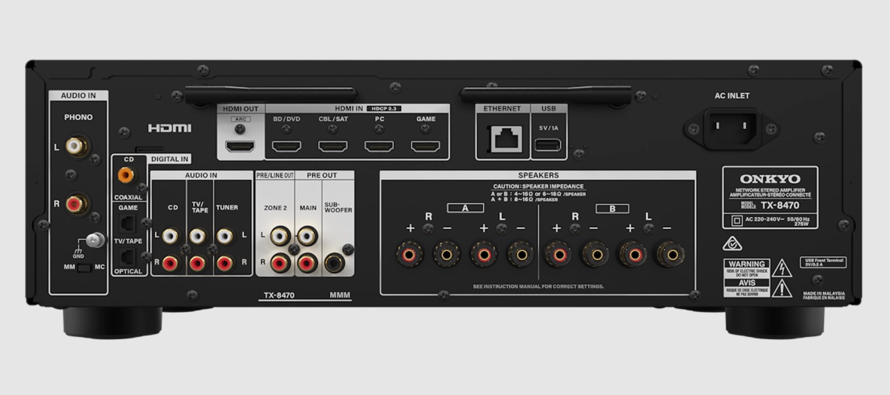 Onkyo has announced the two-channel receiver TX-8470. The new TX-8470 is basically a two-channel amplifier, but the device is equipped with several HDMI connections, two pairs of speaker connections, analogue cinch inputs, digital inputs and even a turntable input. Onkyo seems to have made the TX-8470 for music lovers and movie enthusiasts who do not need multi-channel sound.