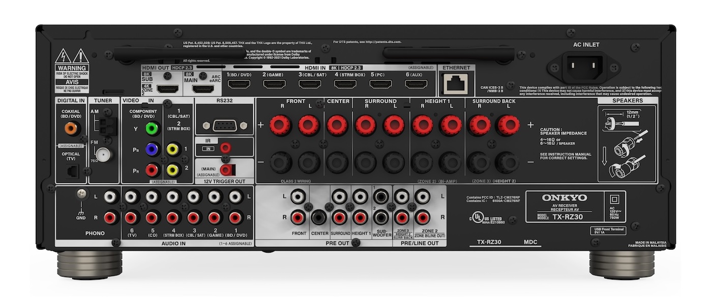 The new 9.2-channel TX-RZ30 is positioned below the TX-RZ50 model (also read our review of the Onkyo TX-RZ50 ). The TX-RZ30's power rating is slightly lower than the TX-RZ50 at 100 watts per channel (two channels driven), but otherwise the units are very similar. In short, the TX-RZ30 supports almost every streaming platform and multichannel codec.