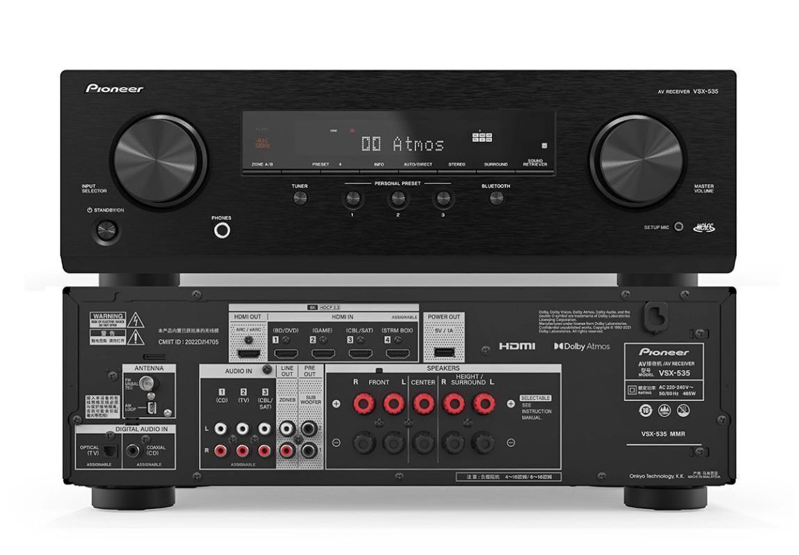 The second model, the Pioneer VSX-535, also decodes Dolby Atmos and Dolby Surround sources and supports HDMI 2.1 with 4K/120Hz and 8K. It implements 5.2 configurations, and an extended IMAX mode is also available.