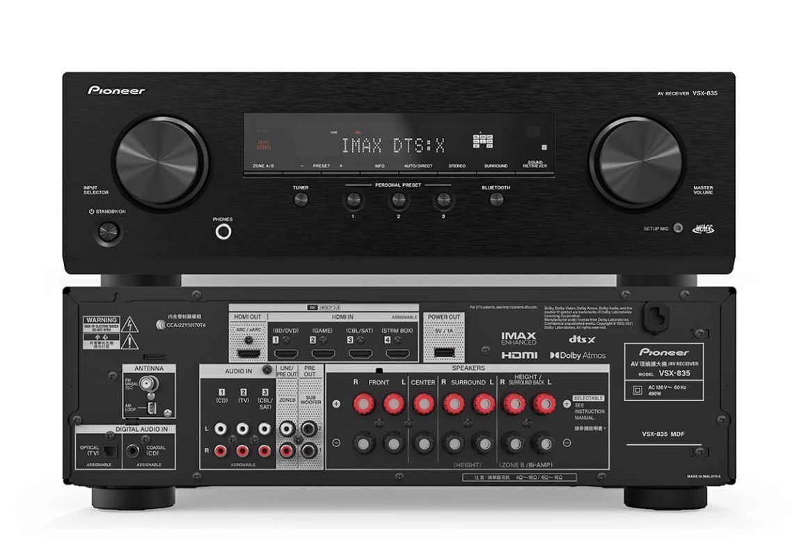 Pioneer VSX-835, has advanced IMAX certification, works with Dolby Atmos and Dolby Surround, DTS Virtual:X via HDMI 2.1 with 8K/4K support. You can create 7.2 or 5.2.2 systems that are calibrated with Pioneer's MCACC (Multi-Channel Acoustic Calibration) software using a dedicated Auto Room Tuning microphone. In addition to DTS:X, the VSX-835 also supports DTS Virtual:X, as well as Dolby Atmos Height Virtualizer, adding three-dimensional sound without overhead or rear sources.