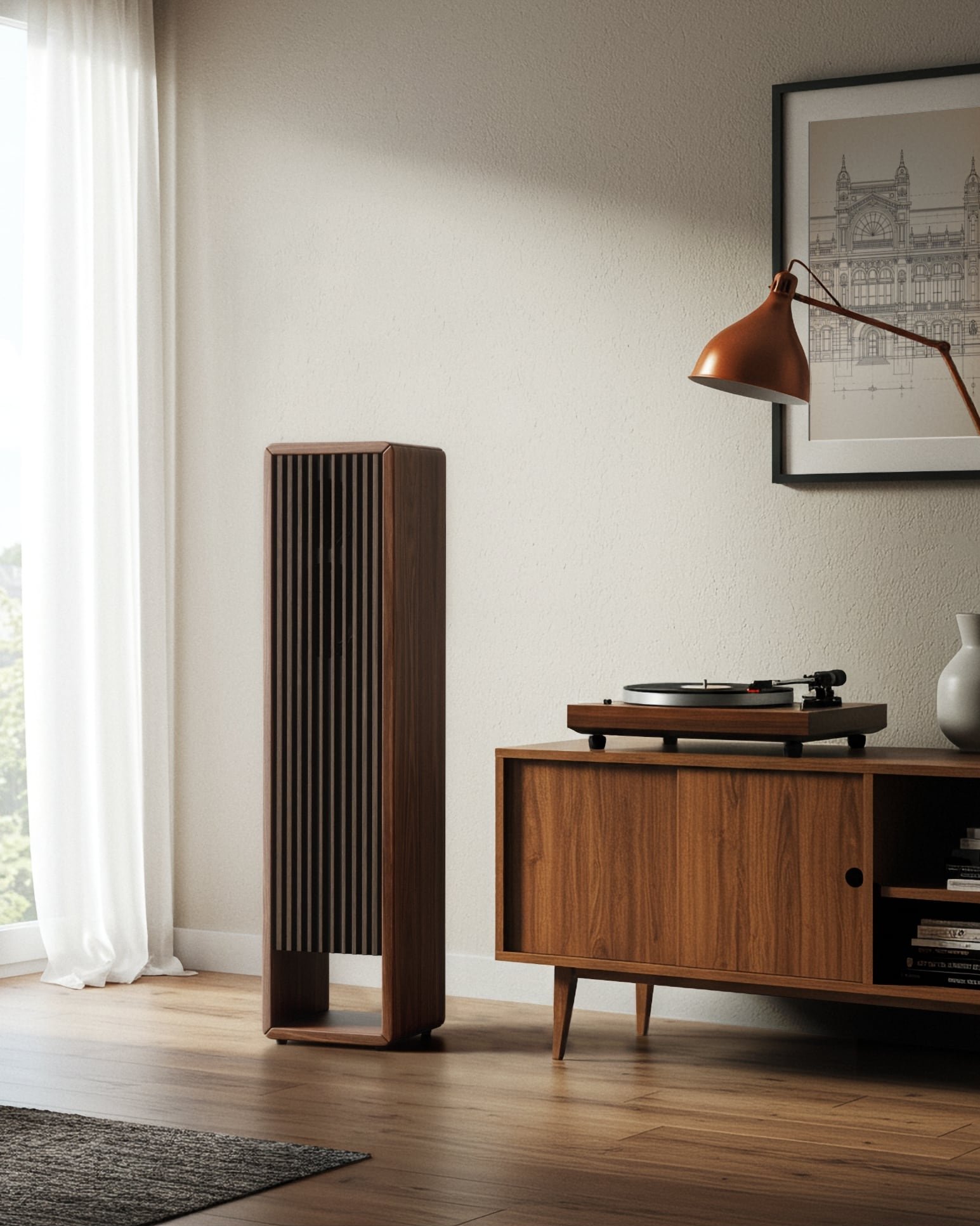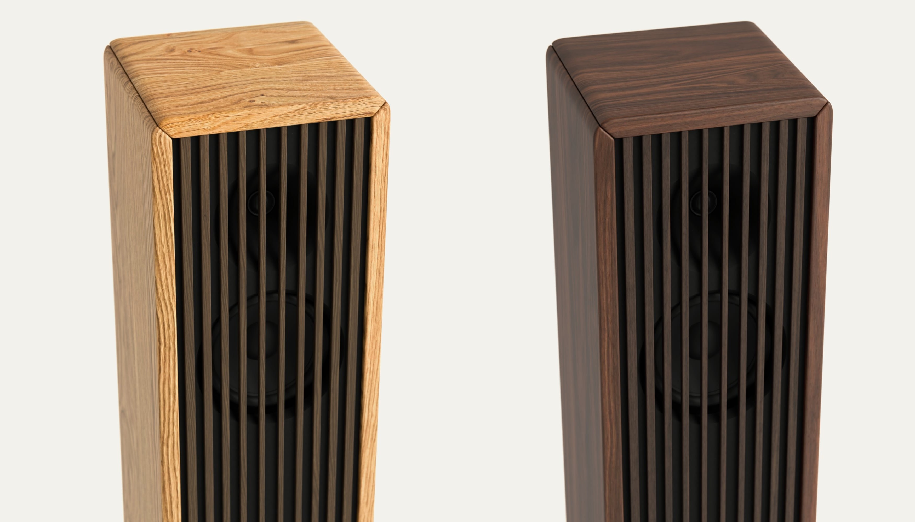 The wooden bars on the front are more than just protection for the drivers. They are a deliberate design element that emphasizes the elegant lines of the speaker. Each individual part is sanded and oiled by hand to emphasize the natural wood grain. The cabinet, made of carefully selected woods, and the many fine details give the B.01 its distinctive appearance.
