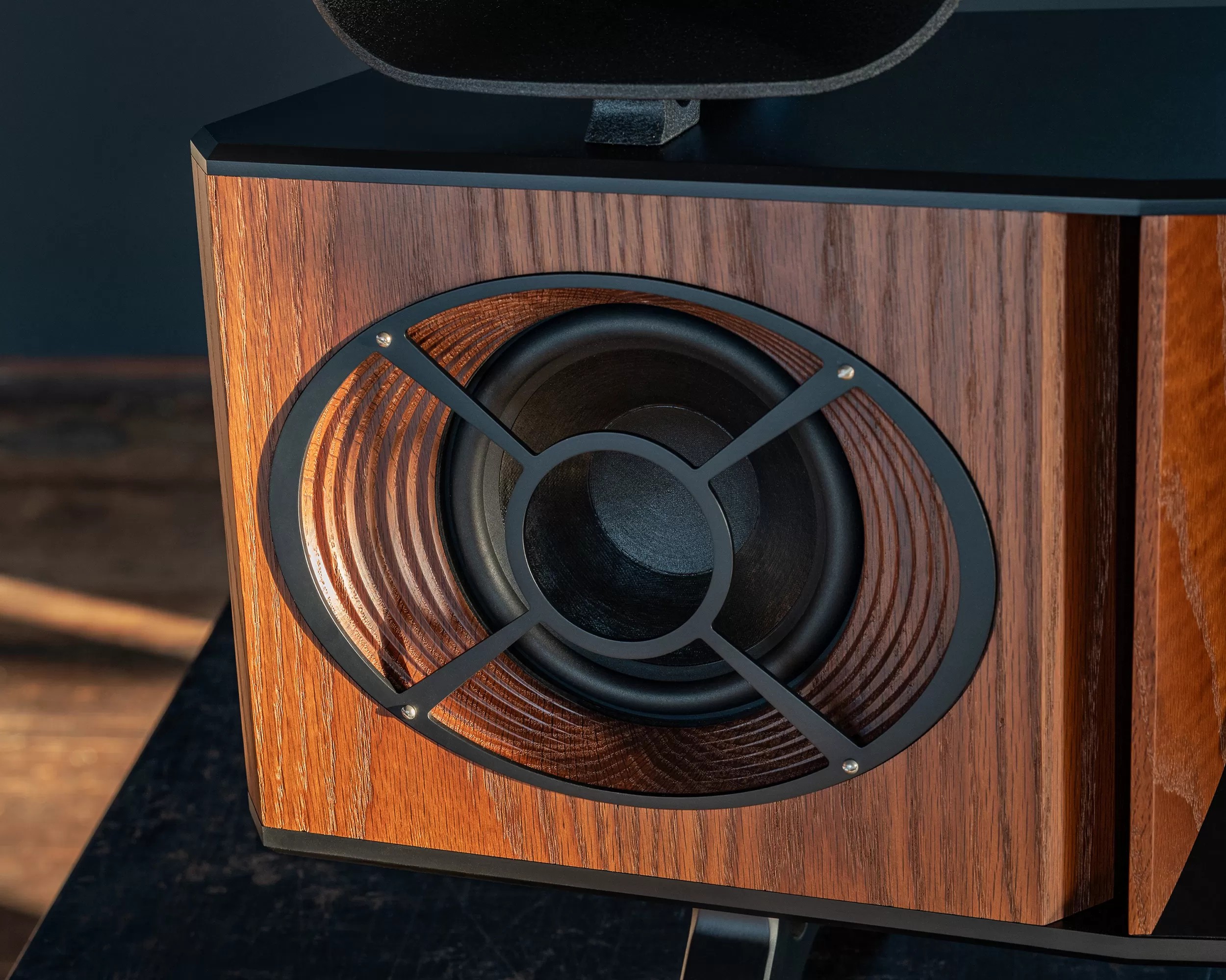 An optional stand made from the same torrefied wood as the speaker itself complements the Excelsior, featuring a robust cast iron base for stability and aesthetic coherence.