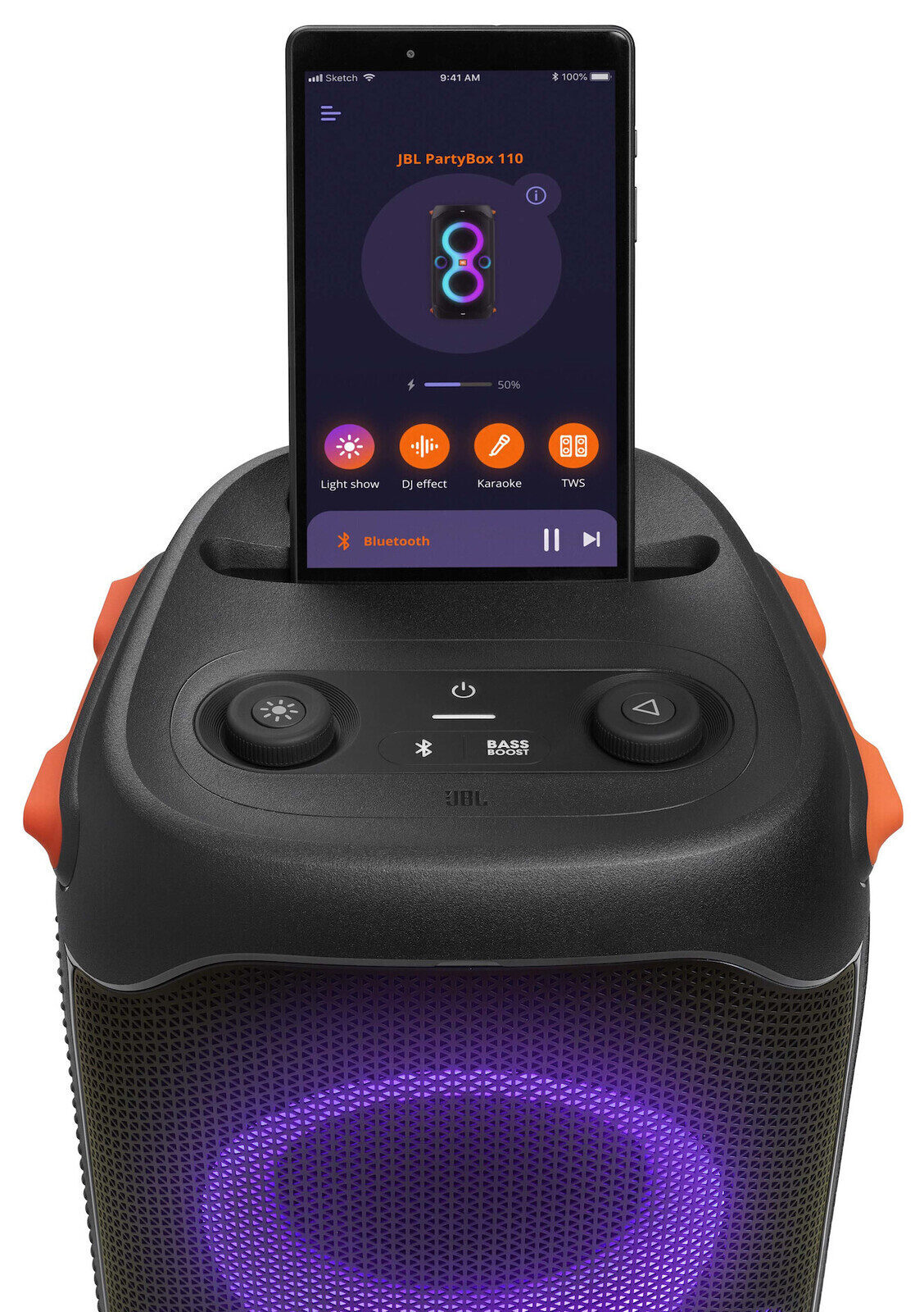 The JBL PartyBox 110 battery is capable of providing up to 12 hours of music – in addition, it is possible to recharge via USB, for example, a smartphone. The bottom wall of the speaker has a hole for mounting on a stand as a “top”, and a handle for carrying is provided in the back.