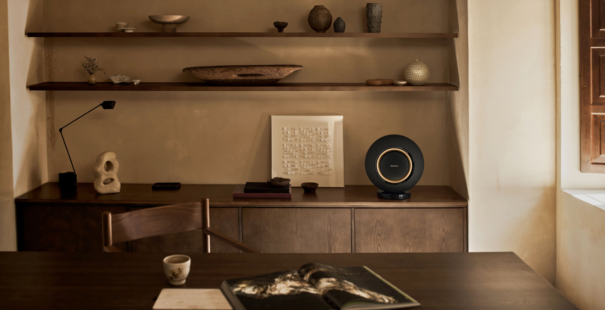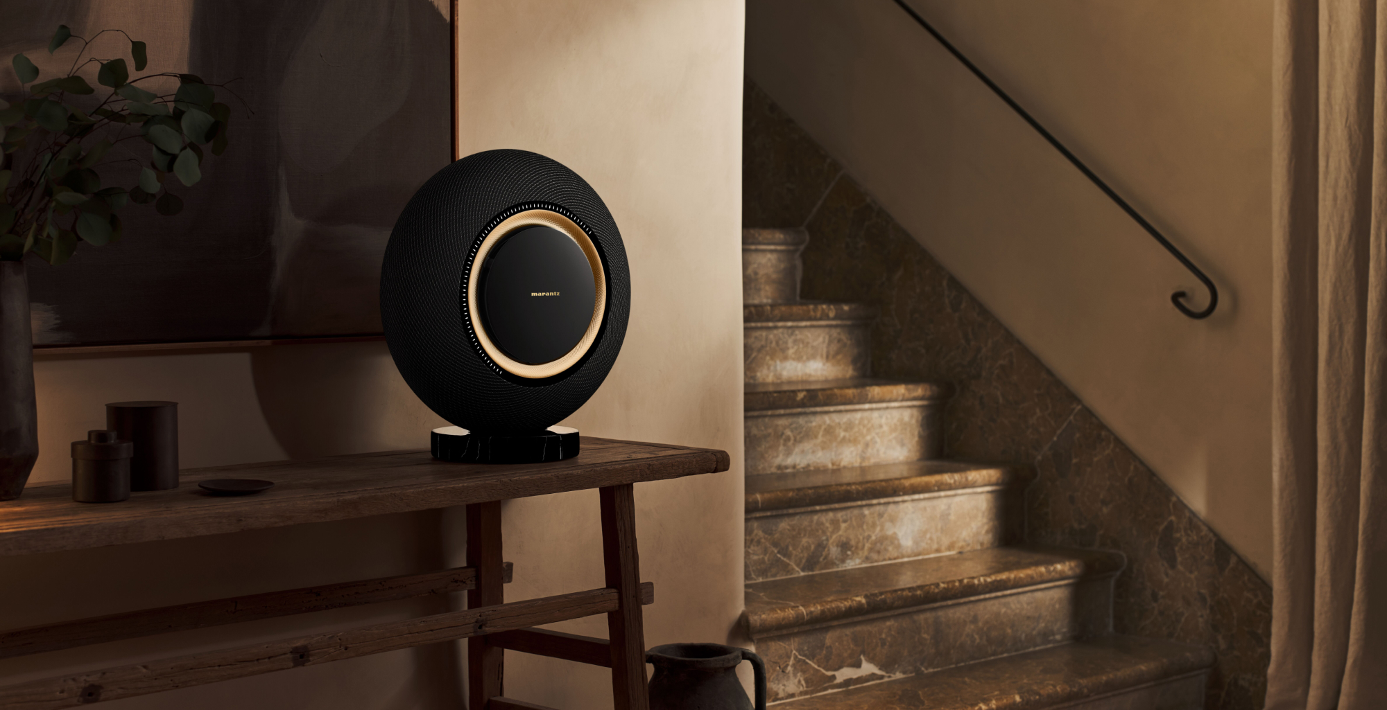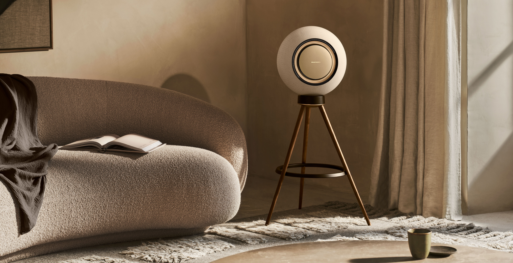 The speakers are available in three colours: the dark Midnight Sky, the bright Moon Ray and the warm Marantz Champagne. Each model rests on a marble base that perfectly matches the speaker colours. For those who want to position the speakers differently, Marantz offers a wooden floor stand for the Horizon and wall brackets for both models. Even unpacking is a special experience with an elegant protective cover that encloses the speakers.