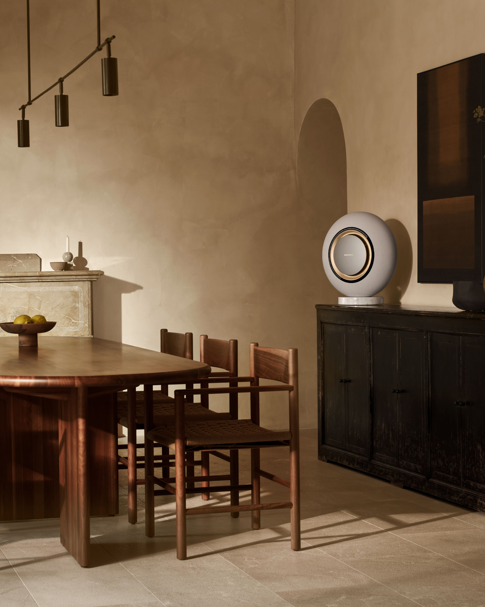The Horizon and Grand Horizon evoke a sense of familiarity with products from the French brand Devialet. While Marantz is not the pioneer of spherical or round speaker designs, this does not detract from their appeal. Both models are crafted from eco-friendly materials. Each speaker is enveloped in Marantz Radiance 360º Seamless Ecofiber, a fabric sourced from recycled ocean plastics, developed in partnership with the fashion industry. The inclusion of gold lurex gives the fabric a luxurious aesthetic and tactile quality, enhancing the overall warmth of both the design and the audio experience.