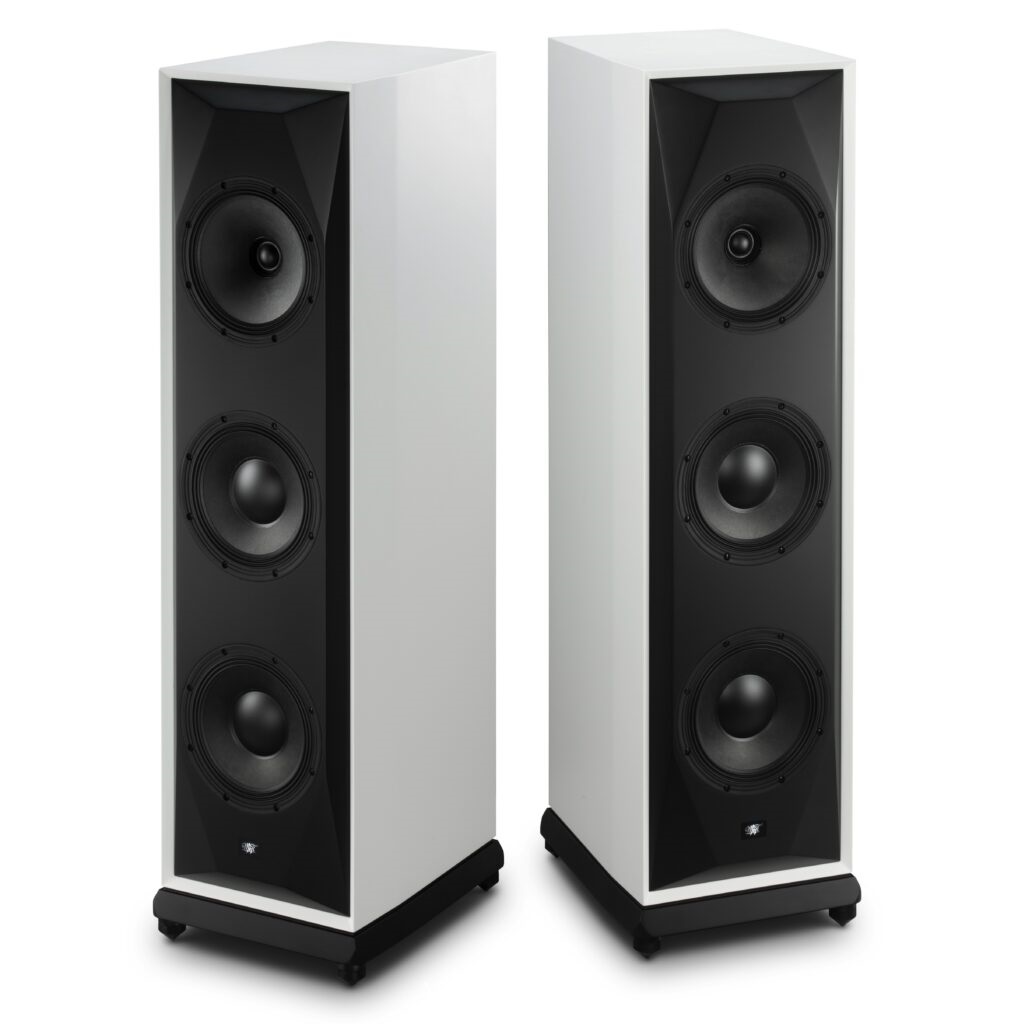 The name SourcePoint 888 is derived from the use of three drivers with an eight-inch diameter. The unique dual drive magnet structure, paper pulp cone and concentrically mounted soft dome tweeter of monitor model SourcePoint 8 have been enhanced with two newly developed dedicated eight-inch woofers to create a three-way floorstanding speaker with exceptional bass extension and dynamics. The two additional woofers operate below 130 Hz, relieving the concentric driver of the task of producing deep bass, allowing it to be fully optimized for midrange and treble, providing greater sonic transparency.