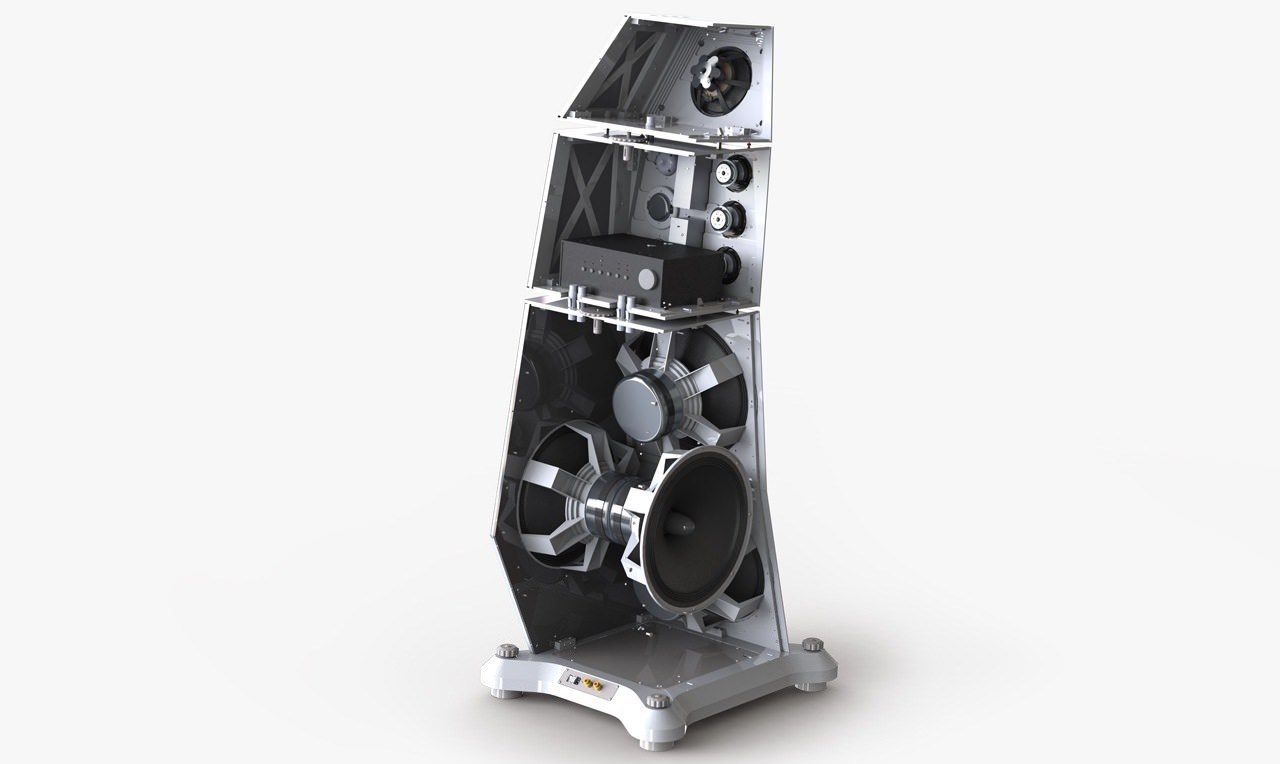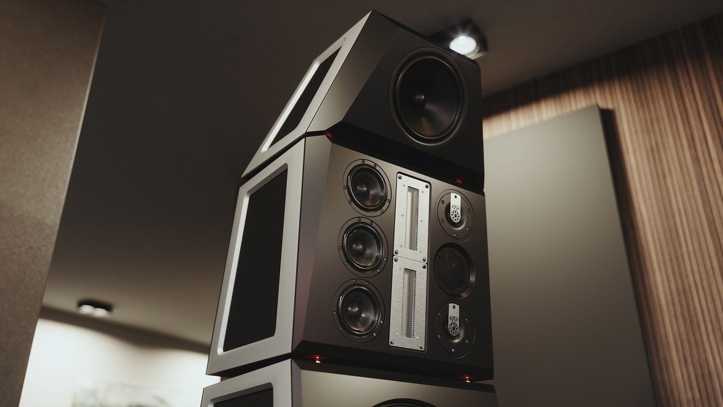 At the bottom level are four 18-inch woofers, a rare home caliber that hit the 17Hz low end. The middle level was occupied by a set of drivers responsible for the mid-high frequency range.