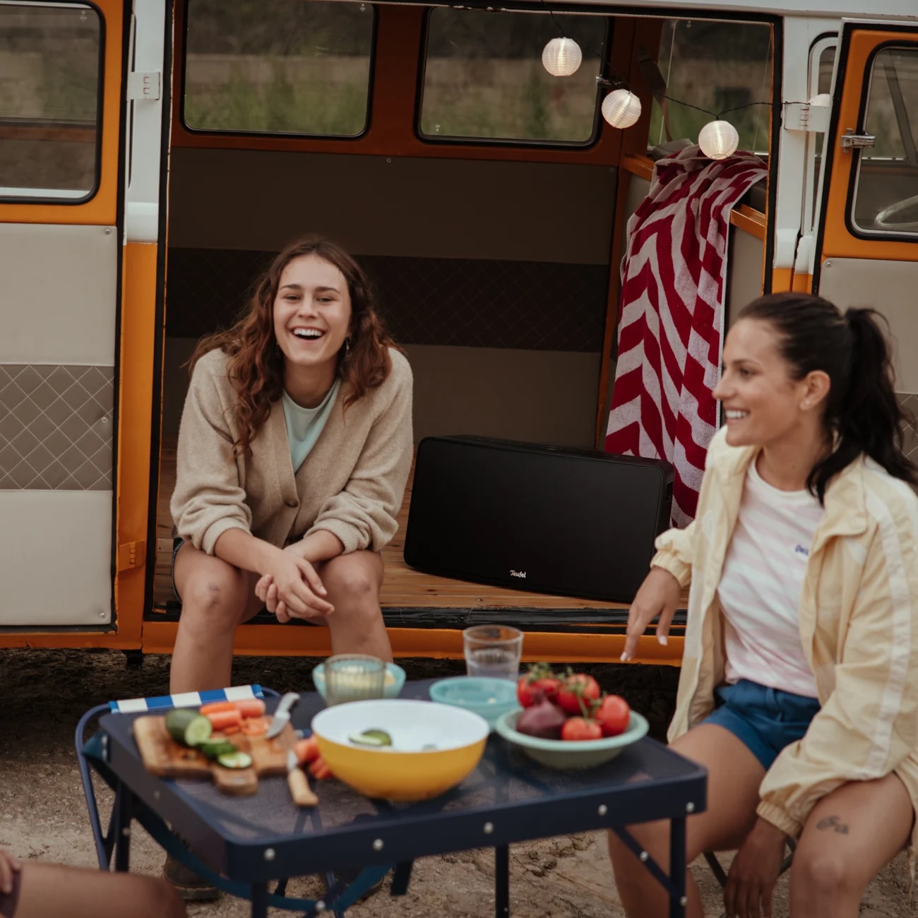 The Motiv XL looks great on a living room sideboard or on the kitchen counter. It provides access to the entire universe of streaming services with a single power cord, which can also be disconnected. Thanks to the built-in replaceable battery and integrated carrying handles, the speaker is versatile. Whether at the office or at the neighborhood barbecue, the Motiv XL can play music wirelessly for up to 13 hours in consistently high quality before needing a recharge.