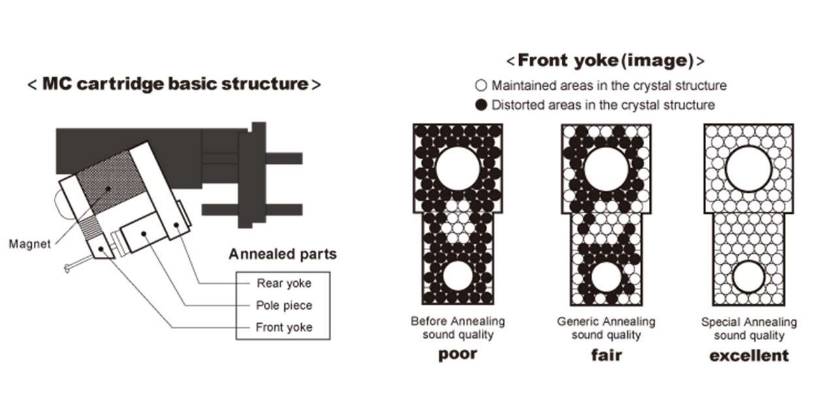Good signal output can only be obtained if the magnetic field has high density and stability. For the magnetic circuit, Dynavector uses pure iron, which has a high permeability to magnetism, which then creates a very strong magnetic field, perfect for interference-free transmission of the signal. However, when the iron has to be converted into small parts, the structure of iron is affected at the atomic level due to plasticity. This causes a decrease in magnetic permeability and therefore a decrease in proper functioning.
