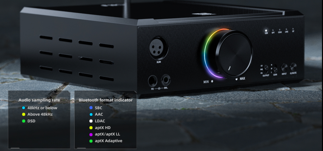 I discussed the interfaces and controls earlier, but before diving into the most intriguing aspects, let me share how I utilized them, along with the features of the application. I connected the K9 to my laptop, using my audio library, and also linked it to my phone through an iFi OTG adapter. To fully utilize its capabilities, you need to install the FiiO Control Panel program on your Windows or Mac. The volume wheel's illumination changes based on the input signal type and sample rate. FiiO's official website provides an image that explains the color scheme. Interestingly, when switching Bluetooth codecs, the backlight color also changes.