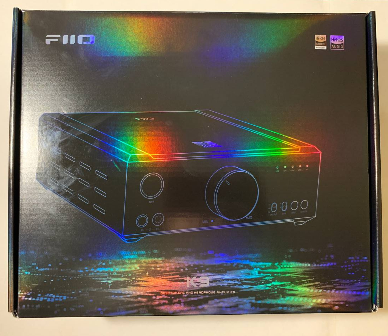 Let's begin by discussing the packaging and setup of this DAC. Upon first glance, the box appears to be a simple black color, featuring a blue textured outline of the device. However, when exposed to bright light, it exhibits a mesmerizing iridescent effect, truly captivating the eye. Additionally, the FiiO logo, as well as the HiRes Audio and HiRes Audio Wireless emblems, are prominently displayed on the box.
