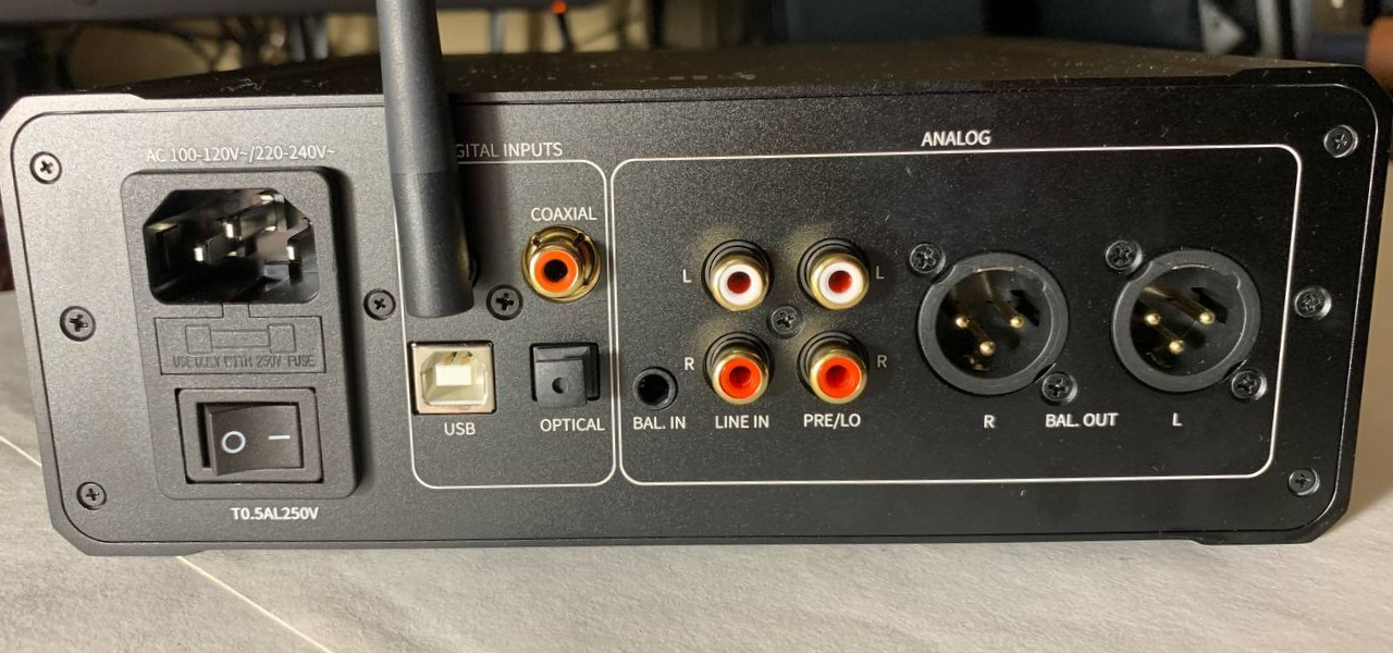 On the right side, there is a button for selecting the connection interface. In the lower right corner, a multifunctional button serves to mute the sound and enter standby mode with a single press, while holding it for 5 seconds powers off the device. Moving to the back, the power switch and power connector are visible. Additionally, there is a Bluetooth antenna on the right side. Inputs include coaxial, USB (for connecting phones, tablets, laptops, or computers), optical input, a 4.4mm balanced input for external players, and RCA inputs. Outputs for speaker systems consist of unbalanced RCA and balanced XLR connections. Notably, the absence of a type-C input for smartphones distinguishes it from the K9 PRO.