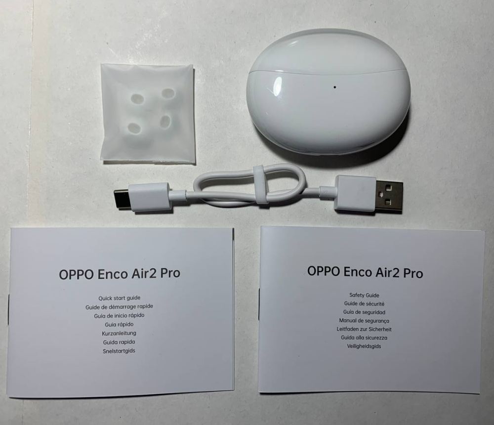 The packaging for the OPPO Enco Air2 Pro is compact, aligning with the headphones' affordable price point by including only the essentials. The design is characterized by minimalism; both the case and the headphones themselves are crafted in white. The case's transparent plastic lid catches and refracts light, lending an additional touch of elegance. Build quality is solid, despite a slight play in the lid—a common trait in this price category. A multi-colored indicator on the front displays the battery level through color changes (green for 100-50%, yellow for 50-15%, and red for below 15%). It shines white when the headphones are unpaired and blinks blue during pairing mode.