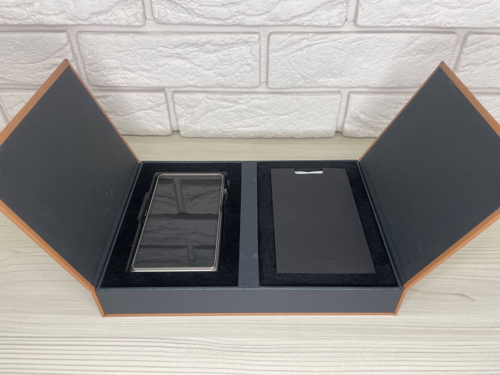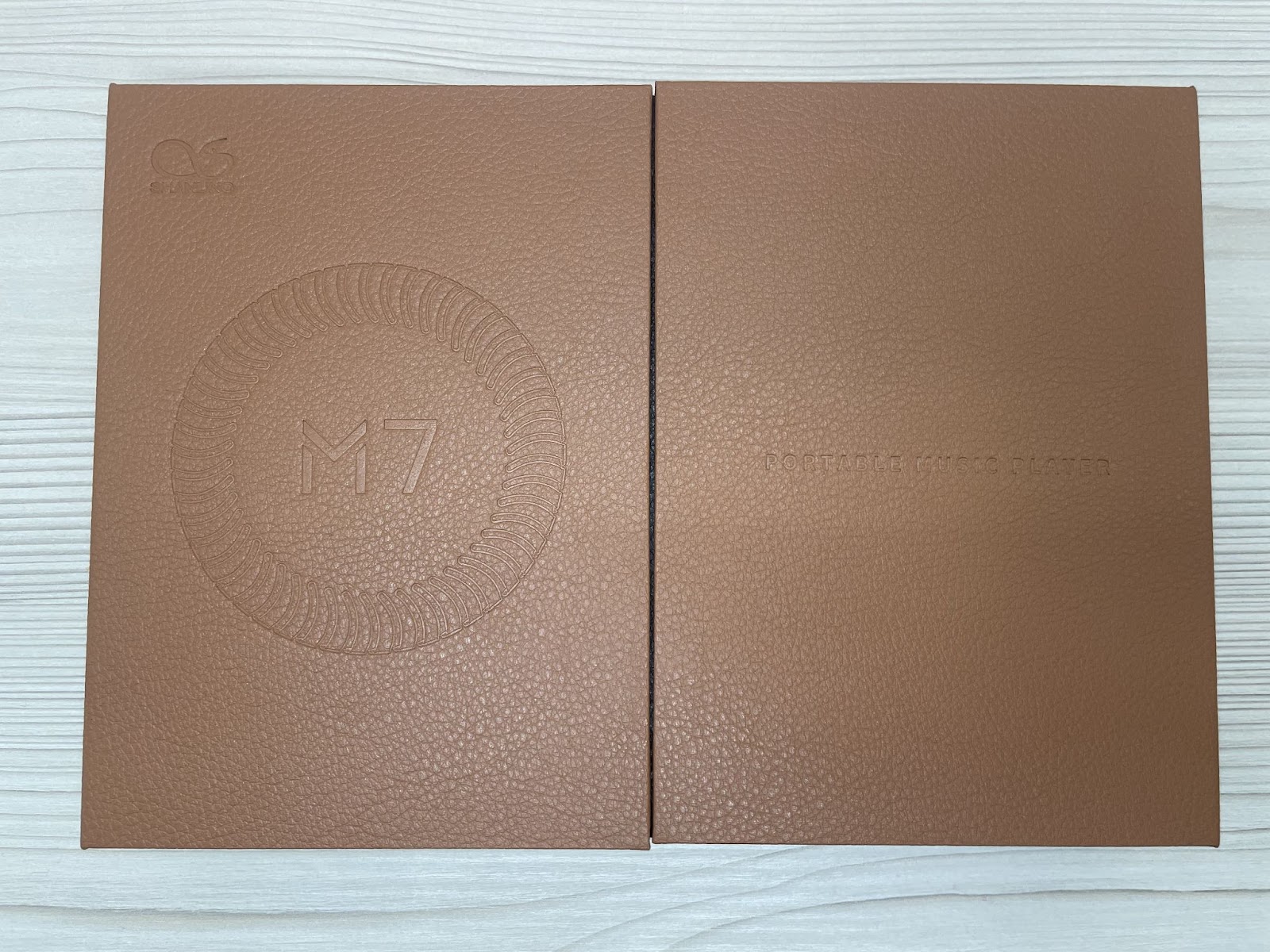 The Shanling M7 arrives in an elegant bronze rectangular box, comprised of two parts. Upon unwrapping, the tactile box, reminiscent of leather in texture, is revealed. Opening it like a book reveals the player on the left side, while accessories are neatly arranged on the right. The presentation is captivating, designed to evoke a sense of admiration and excitement.