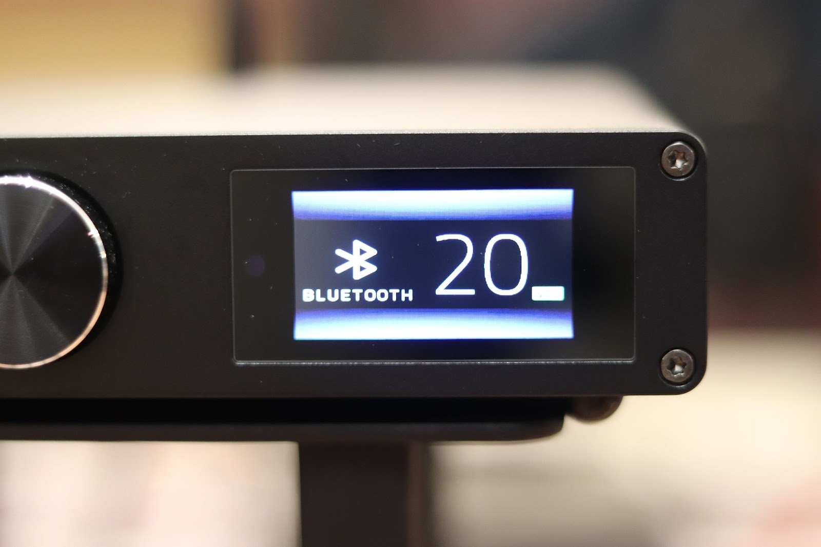 The device can be switched off by a long press on the volume knob. Additionally, it comes with a rather minimalistic remote control that can somewhat address the ease-of-use concerns. This remote includes a button for toggling Bluetooth into search mode, as well as a button for cycling through inputs sequentially, offering a more straightforward way to manage some of the device's functions without navigating through the menu system.