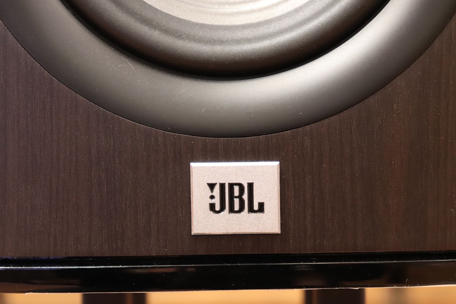 The design philosophy behind the JBL Studio 630 speakers evidently prioritized the elimination of sharp corners, a goal largely achieved except for where horizontal surfaces meet vertical ones. The top surface of these speakers is finished with a glossy coating reminiscent of piano lacquer, while the remaining sides are wrapped in a film, offering a “dark walnut” color and texture in this instance. Although the speakers present a visually appealing design, a closer inspection reveals a wish for higher quality in the film application, especially at the seams, though such imperfections are only noticeable upon close examination.