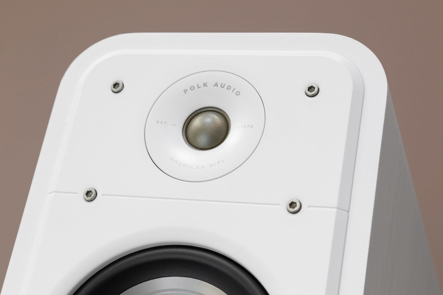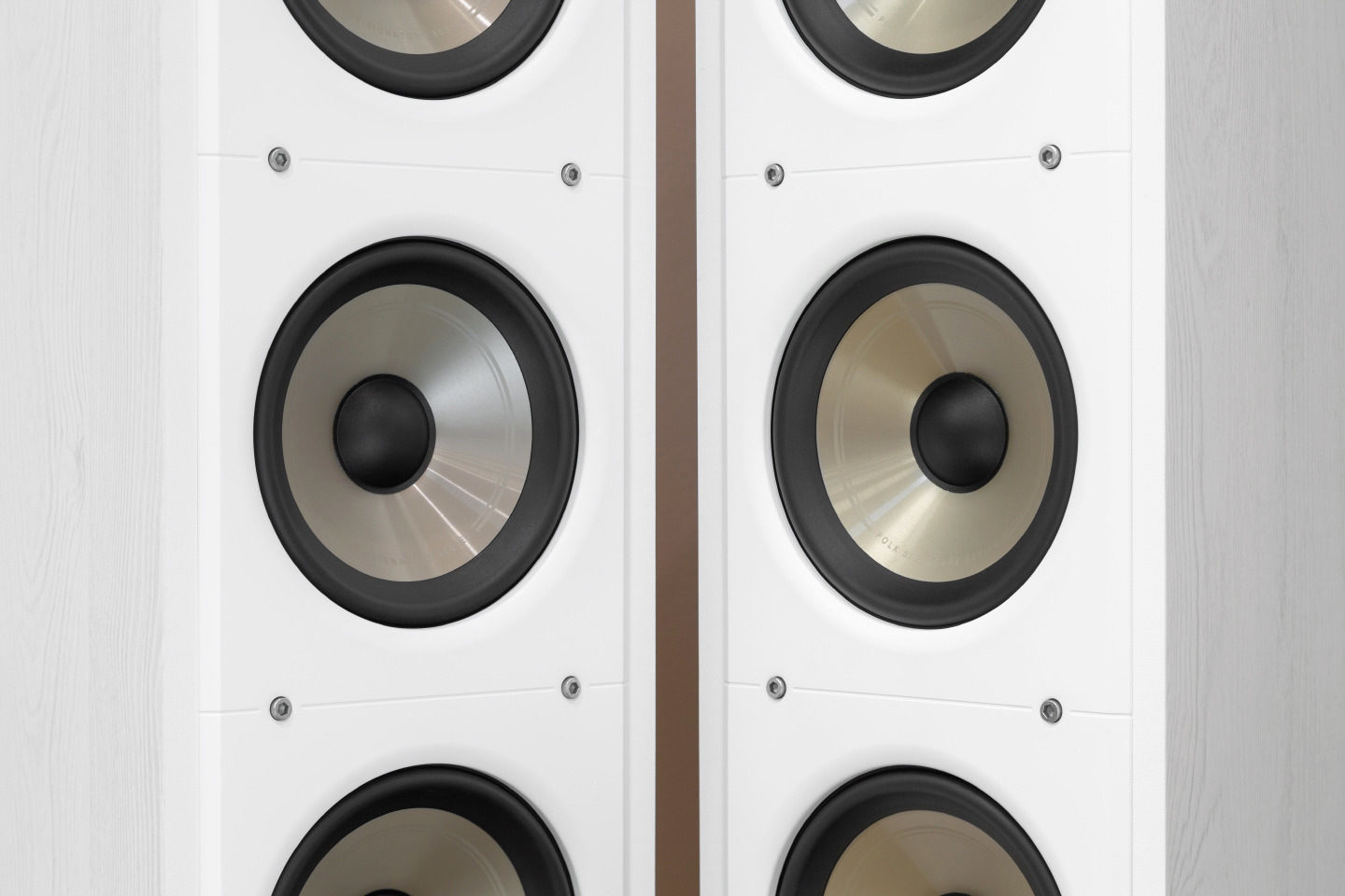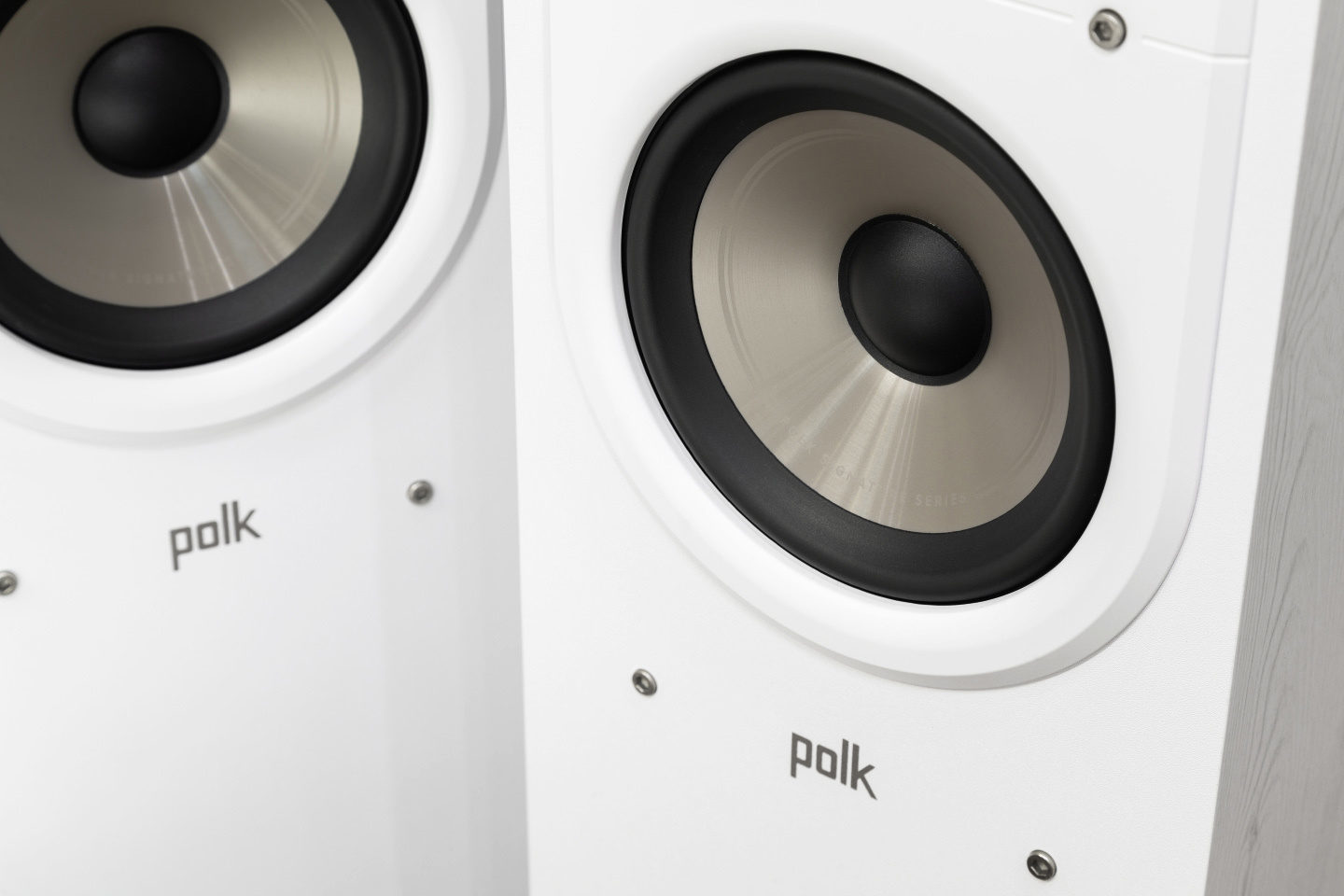 The Polk Audio Signature series breaks away from the norm with its design intricacies. Unlike the straightforward rectangular shapes often seen in mass-produced speakers, these units feature gently rounded edges along the horizontal ribs of the body, revealing a complex design upon closer examination. The cabinets, while not concealing their vinyl finish, are impeccably crafted without any visible defects. Available in three finishes—white, black, and a natural brown with a walnut texture—they cater to a variety of aesthetic preferences. The design is further accentuated by several pairs of rugged hex head bolts that contrast sharply against the cabinet's flawless surface, embodying an industrial rather than luxurious aesthetic.
