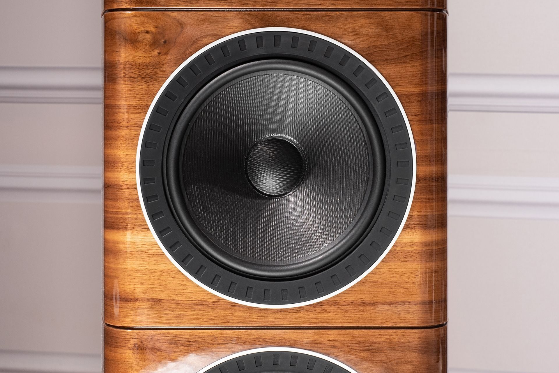 It has the clarity of brutalism, form follows function: precisely calculated rounded sides, tapering towards the back wall, are adjacent to a flat, wide front panel, on which black emitters are framed by the thinnest metal rings. In the monochrome version, the acoustics become an art object from the era of retro-futurism. At the same time, the quality of the finish is excellent: the veneer is precisely fitted, six layers of varnish shine dazzlingly without a single smudge.