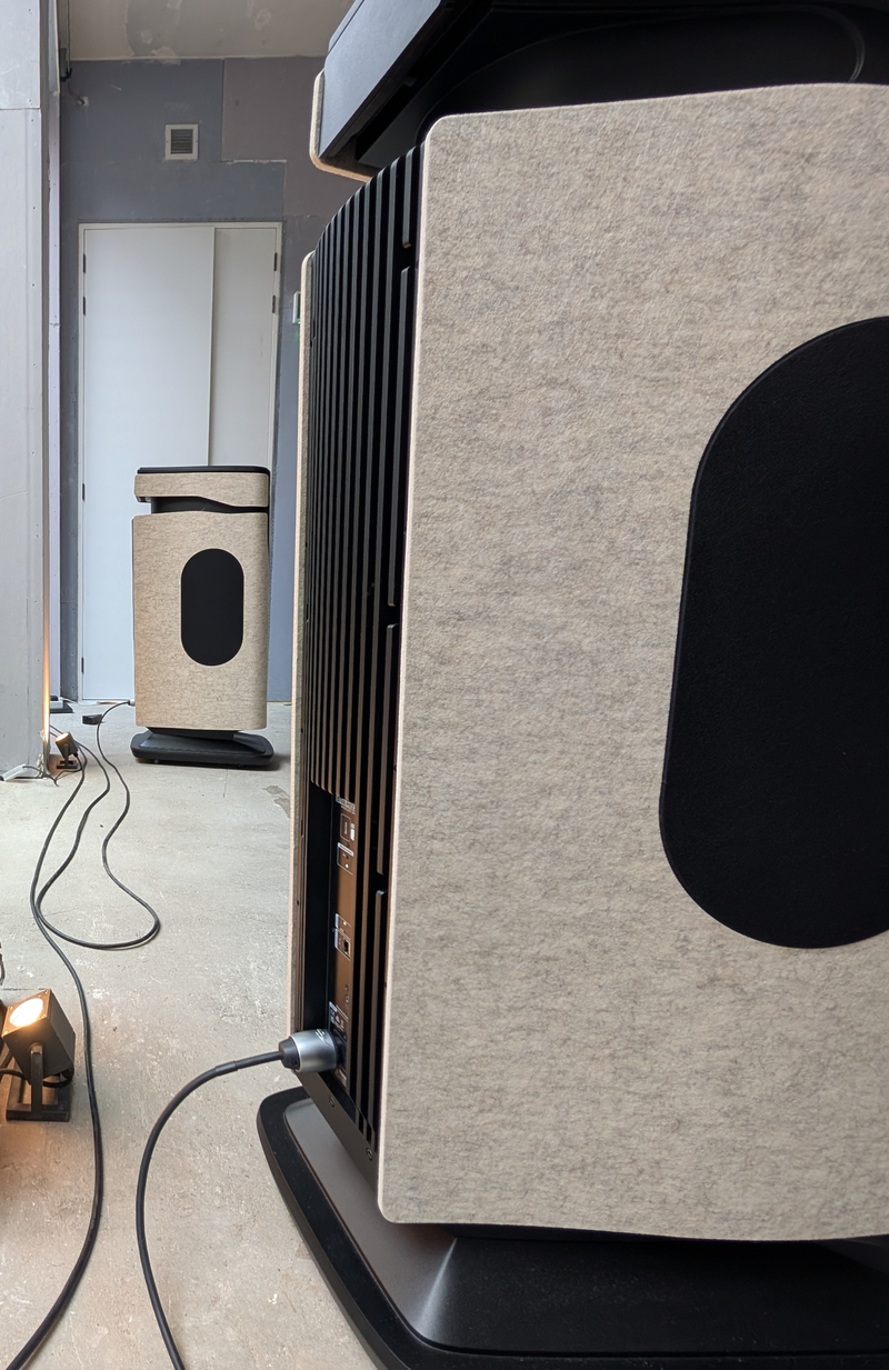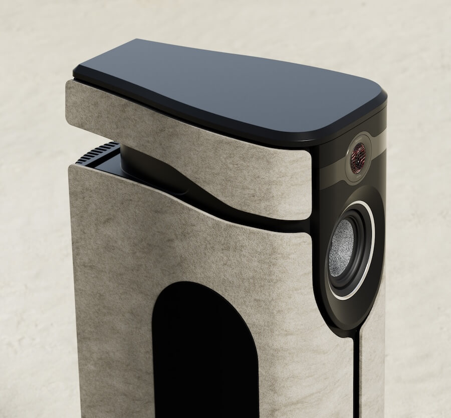 The new three-way active Diva Mezza Utopia goes above and beyond the previous Diva Utopia in every way . Amplification power has increased from 400 watts to 500 watts per speaker. Standing 127 centimeters tall and weighing 90 kilograms, each speaker features a 27-millimeter inverted dome “M”-profile beryllium tweeter (type IAL2) driven by a 90-watt Class AB amplifier, a 16.5-centimeter W midrange driver driven by a 130-watt amplifier, and four 20.5-cm push-push woofers backed by 280 watts of Class AB power.