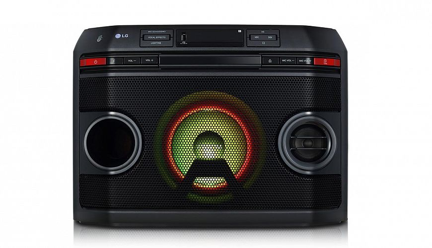 In addition to optical audio input, microphone port, Bluetooth 4.0 connection , USB port and CD drive, the LG ON88 audio system is equipped with a guitar input as well as an FM radio. The equalizer of the system will help you choose the optimal settings for listening to music of various styles, including pop, rock, jazz, classical, Bass Blast. There is also a “Football” mode and the ability to connect to a TV. Additional EQ presets optimize the sound for Dangduot, Arabic, Afro Hip-Hop, Indian, Reggaeton, Merengue, Salsa, Samba, Forro, Funk, Sertanejo.
