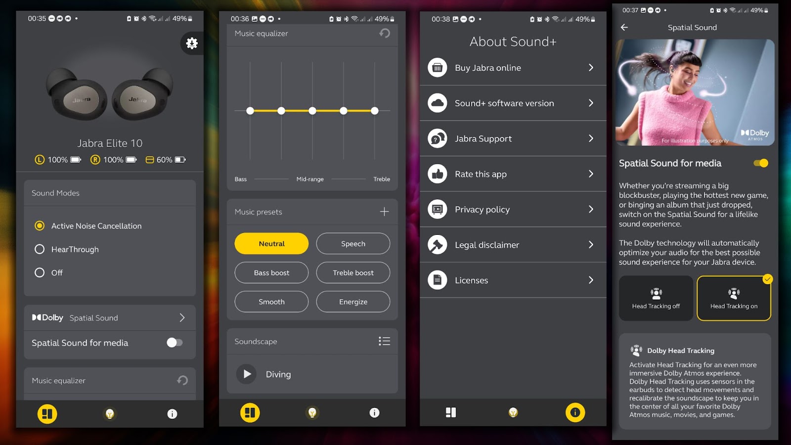 The application, named Sound+, is accessible for download from both PlayMarket and AppStore, and it is free of charge. Upon installation, users are prompted to enable location services to accurately identify the headphone model and color. The app provides a user-friendly introduction, guiding users on how to operate the headphones efficiently. While the application offers various features, I will highlight the one that impressed me the most.
